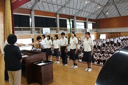 式のはじめに、1年女子Mさんが、1学期の反省を生かして、夏休みは学習と部活動の両立を図って努力したことを述べました。そして、2学期は行事、部活動、学習と多方面で努力をして充実した学期にしたいと抱負を述べました。