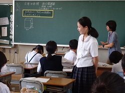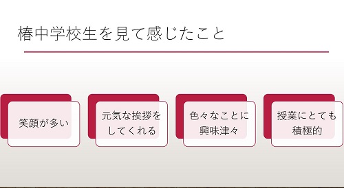「私が、今週椿中学校の様子を見学させていただいて、感じたことをお話します。今まで他の学校にも見学に行きましたが、椿中のみなさんは特に笑顔で元気に挨拶してくれることがとても印象的でした。また、色々なことに興味を持って質問してくれました。しっかりと挨拶をしたり、疑問に思ったことを遠慮せずに質問することを癖づけていると、みなさんが大人になった時に絶対役に立ちます。授業中もたくさん手が挙がっていて、とても積極的に参加している様子がうかがえました。あるクラスでは、数えるのが追い付かないくらいほとんどの人が手を挙げていて、本当に感心しました。私は人前で話すのが苦手なので、間違いを恐れずにチャレンジする姿を見て、私も皆さんを見習わないといけないな、と思いました。この4日間で、椿中生にたくさんのことを学びました。これからも自分に自信を持って、色々なことにチャレンジしてくださいね。そして、今しかない青春を毎日精一杯楽しんでください。4日間、皆さんと過ごすことができてとても楽しかったです。ありがとうございました。」